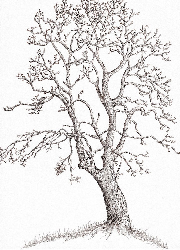 Illustrated in the pointillism technique, after an old apple tree that I saw and photographed in Lower Austria, on windy hills with old orchards.